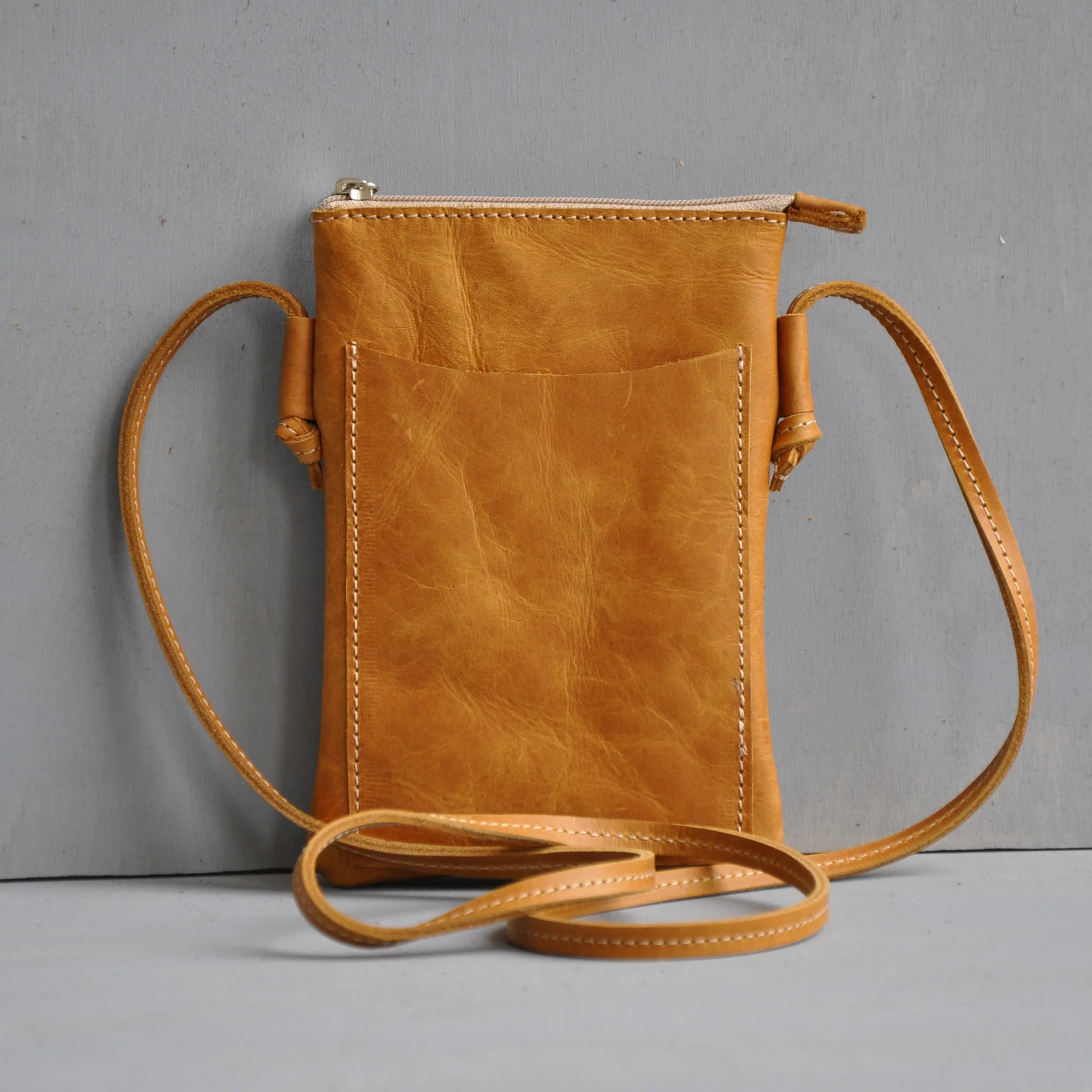 Genuine leather sling bag, with leather straps. Zip close top. All bags with outside pocket. Fully lined with cotton twill.