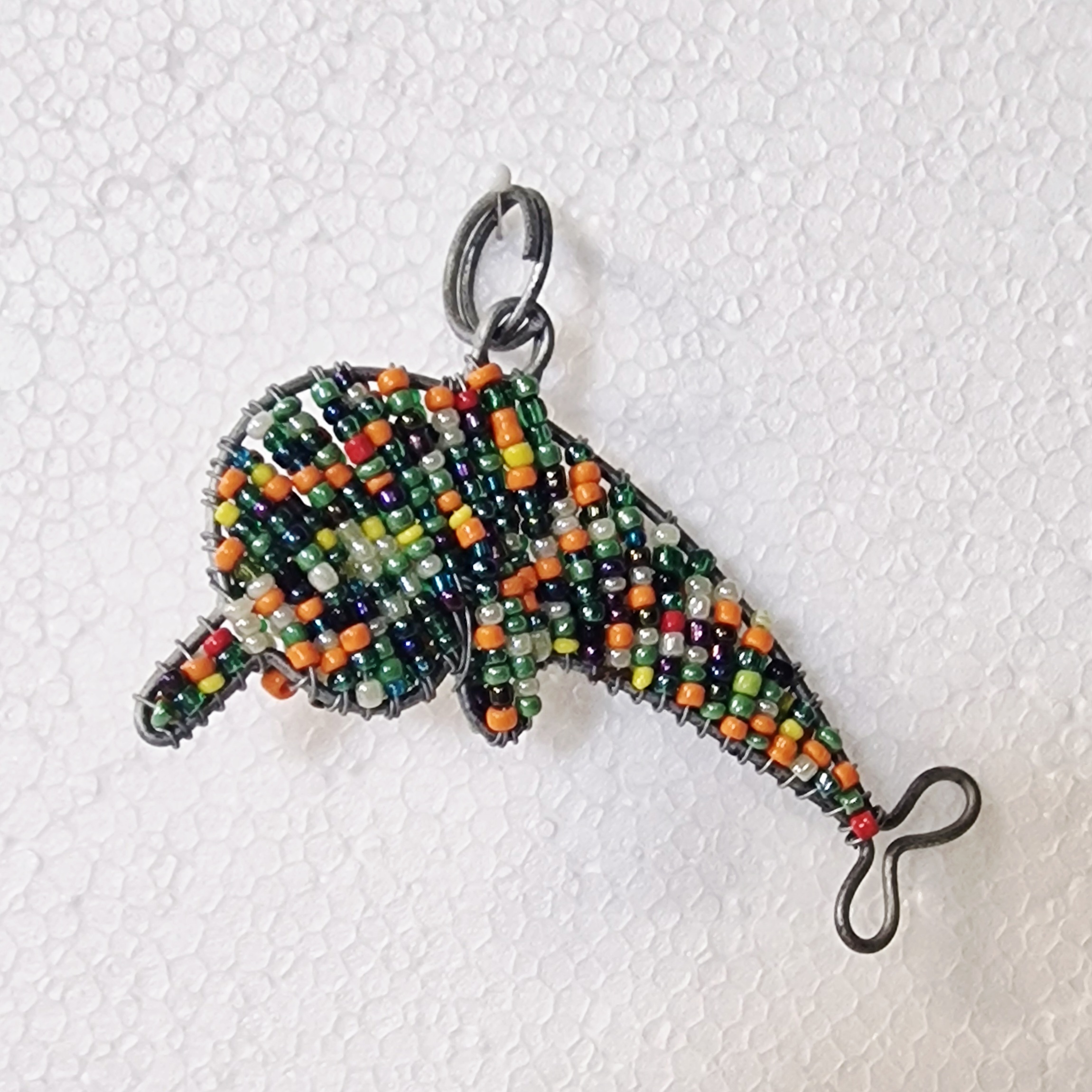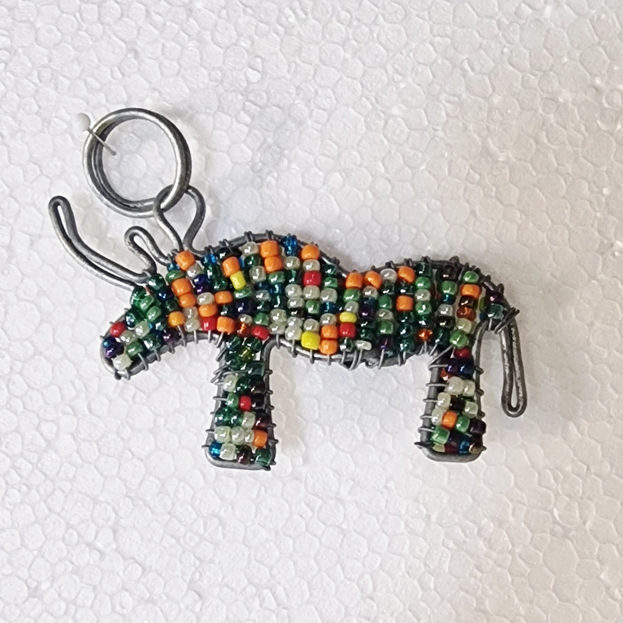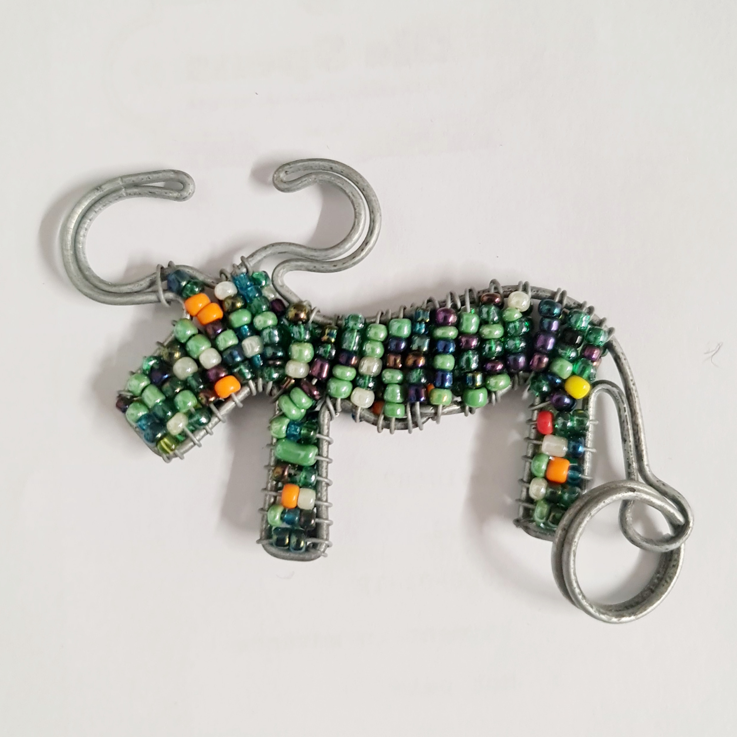 African animal keyrings made of beads and wire. All handmade in Newcastle, South Africa by Owen. Elephant, rhino, giraffe, lion, wildebeest, dolphin
