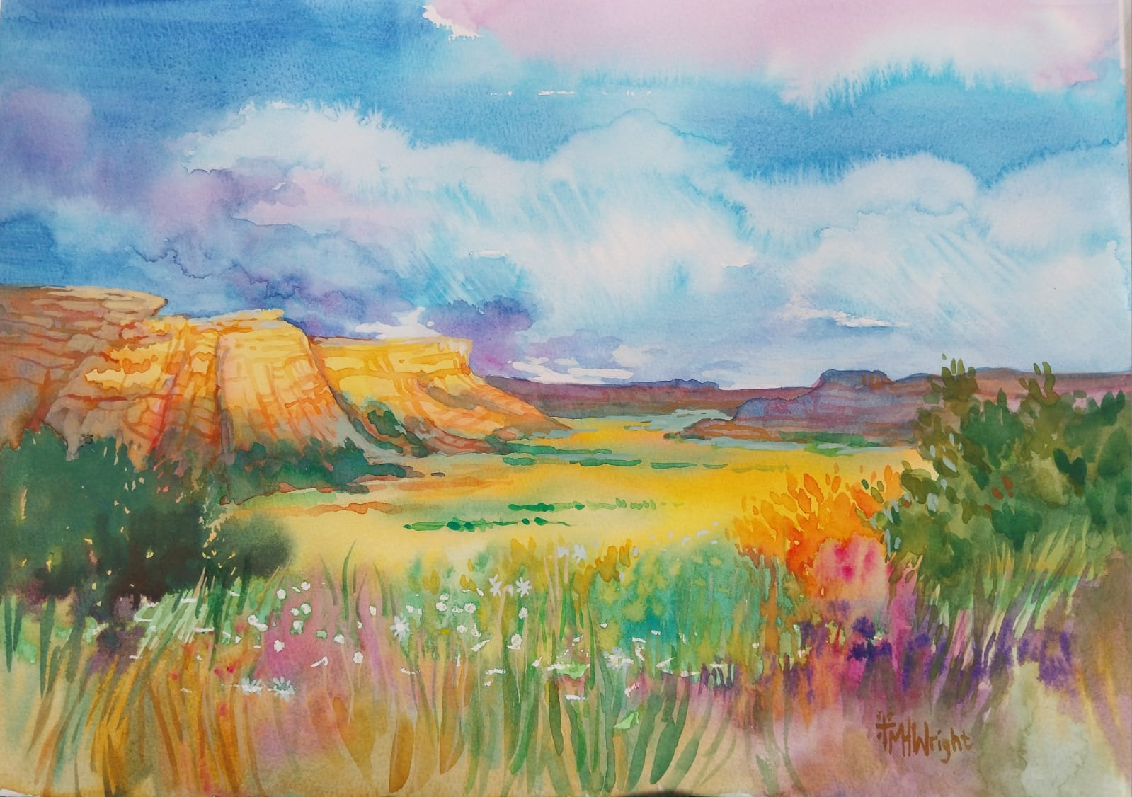 Michelle again: “So far, my life has been adventurous, and I’ve been fortunate to see many beautiful places, but the Karoo and South Africa has great scenery. Thus, the body of my work are landscapes, with a smattering of flowers, abstracts and gardens. I portray the mountains as characters, farmsteads as the homes of my family and friends, and the windmills as symbols of life-giving water. Spitzkoppe and flat-topped mountains, boulders and plains, Shepherd’s huts and old farmhouses with their hard-won gardens are my favourite subjects. I want to make people fall in love with the tranquillity and majesty of the Karoo and encourage tourism to this magnificent part of South Africa. The Karoo has had many years of harrowing drought and farming is more difficult than ever with mega-farming, disinterest from the government, ‘fracking’ and drugs infiltrating farming communities. Paintings of the Karoo can record beloved farms and countryside; maybe bring visitors, businesses or young farmers to the region.”