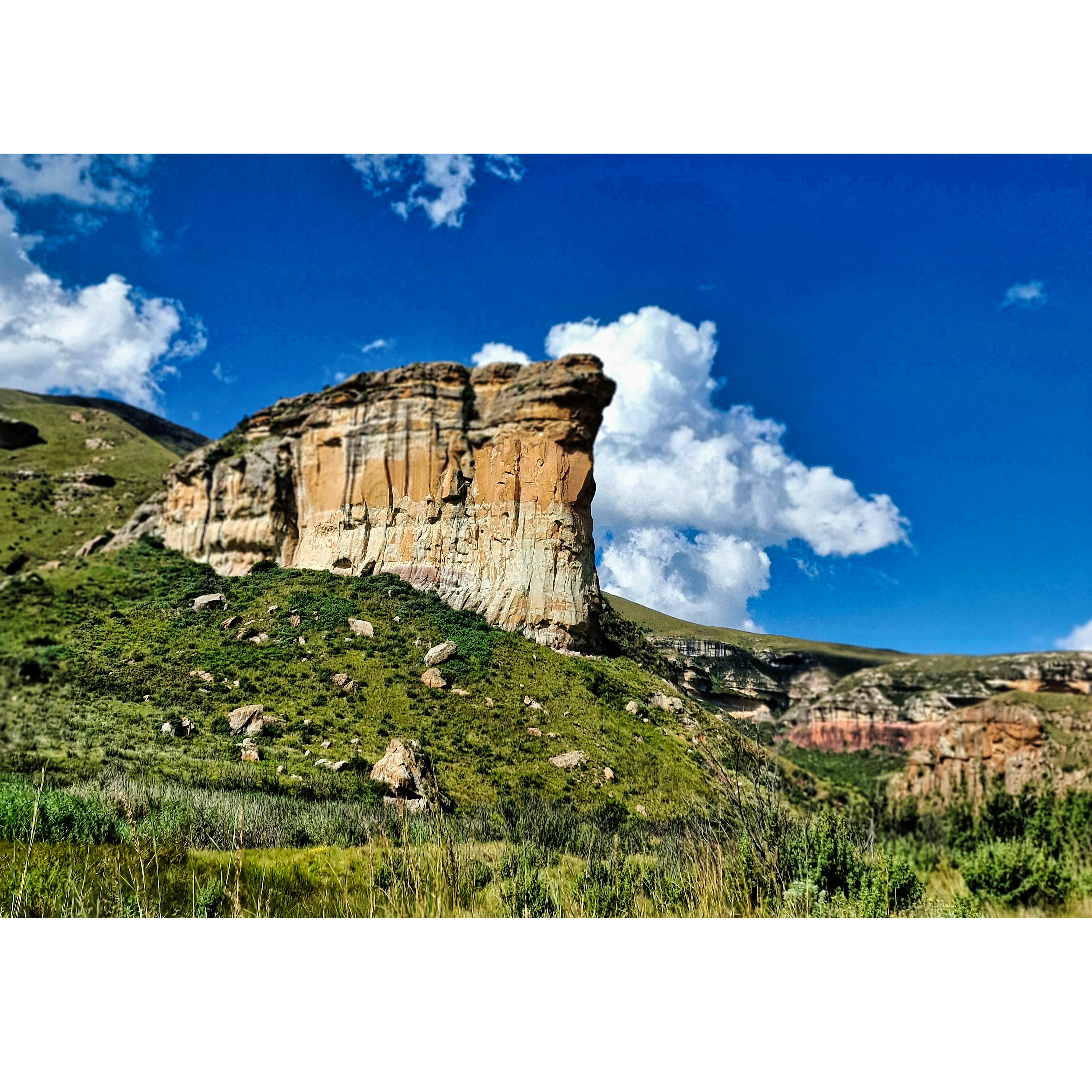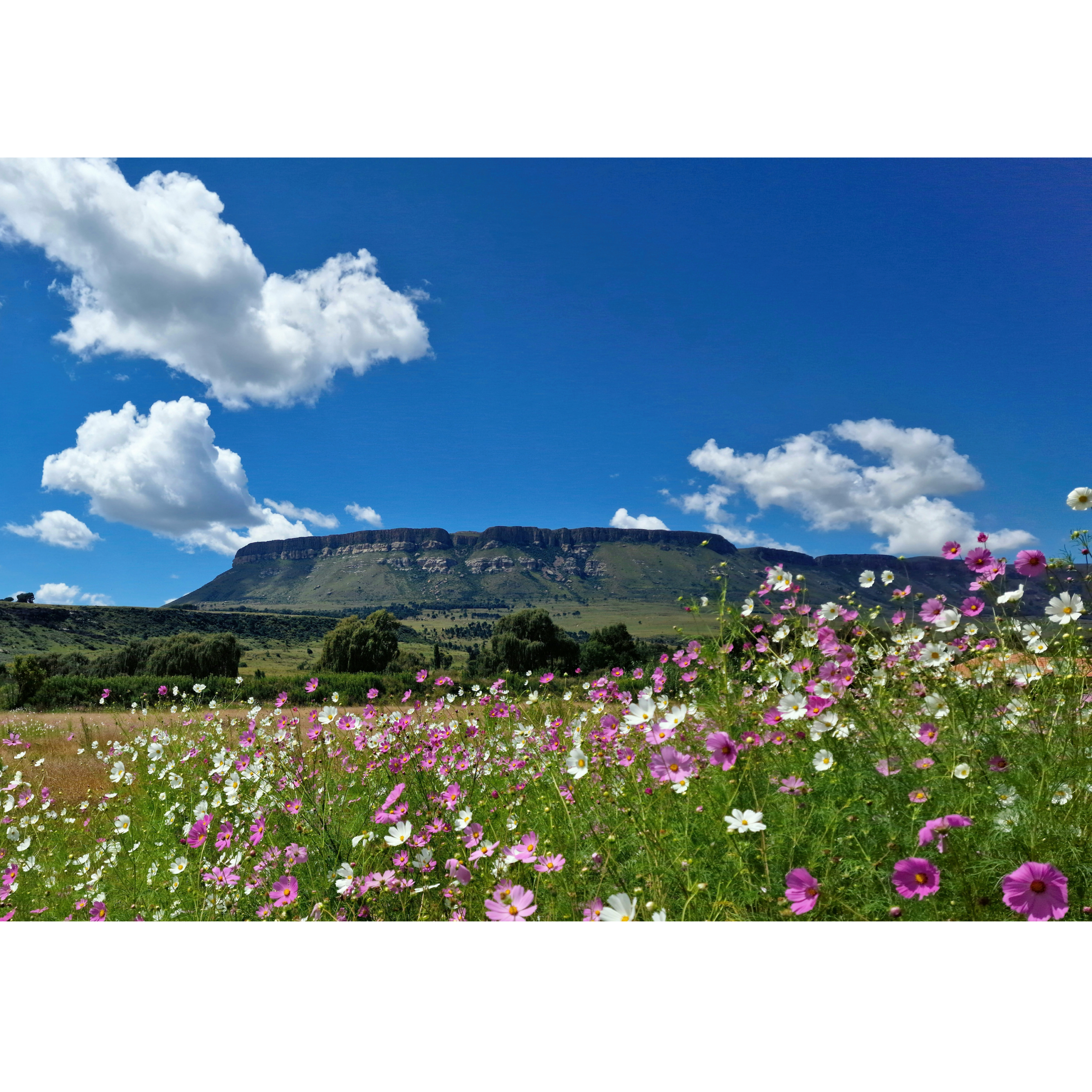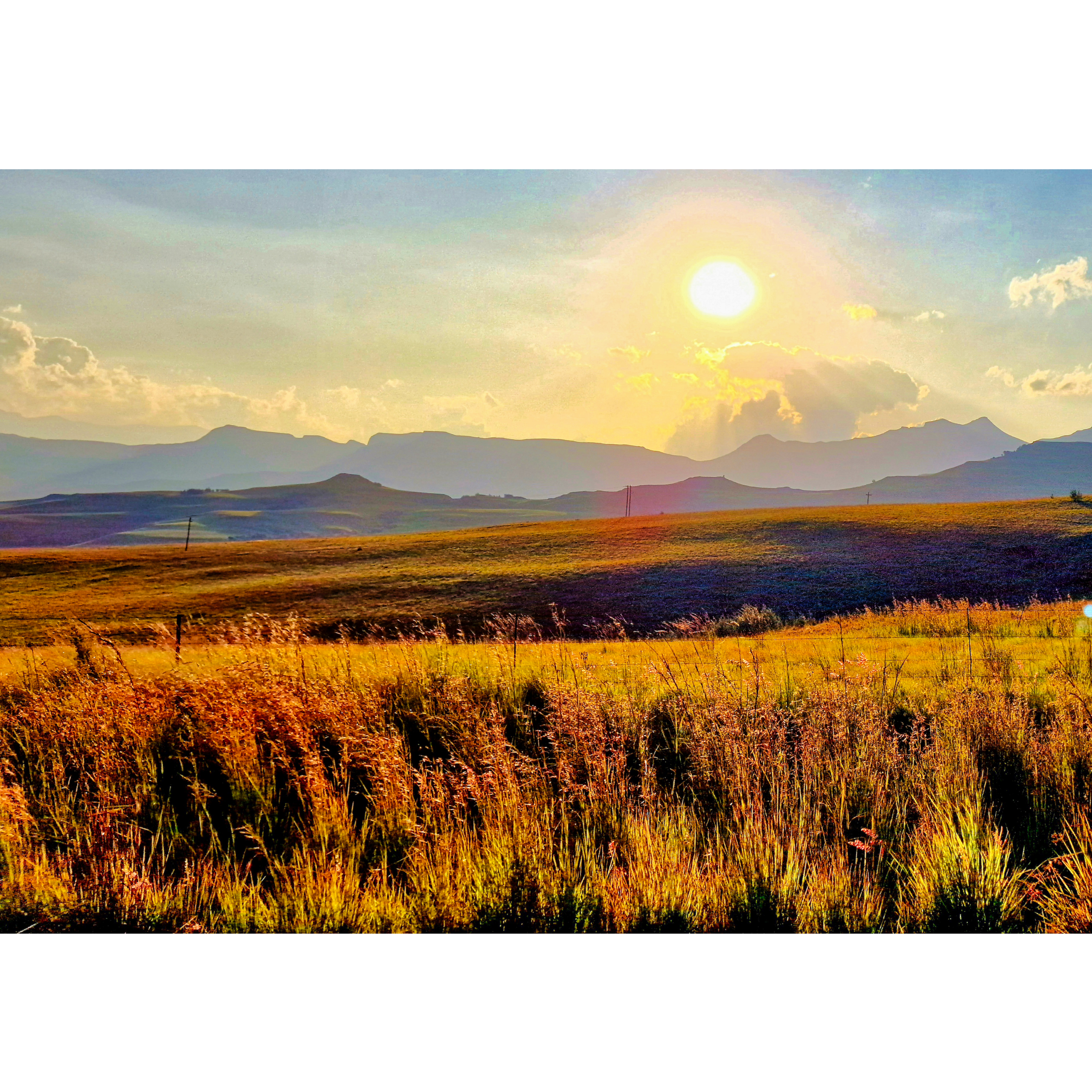 Postcards – South African scenery. Drakensberg, Lions, Free State landscapes, zebra and foal, giraffe, Golden Gate, windmill with kosmos…